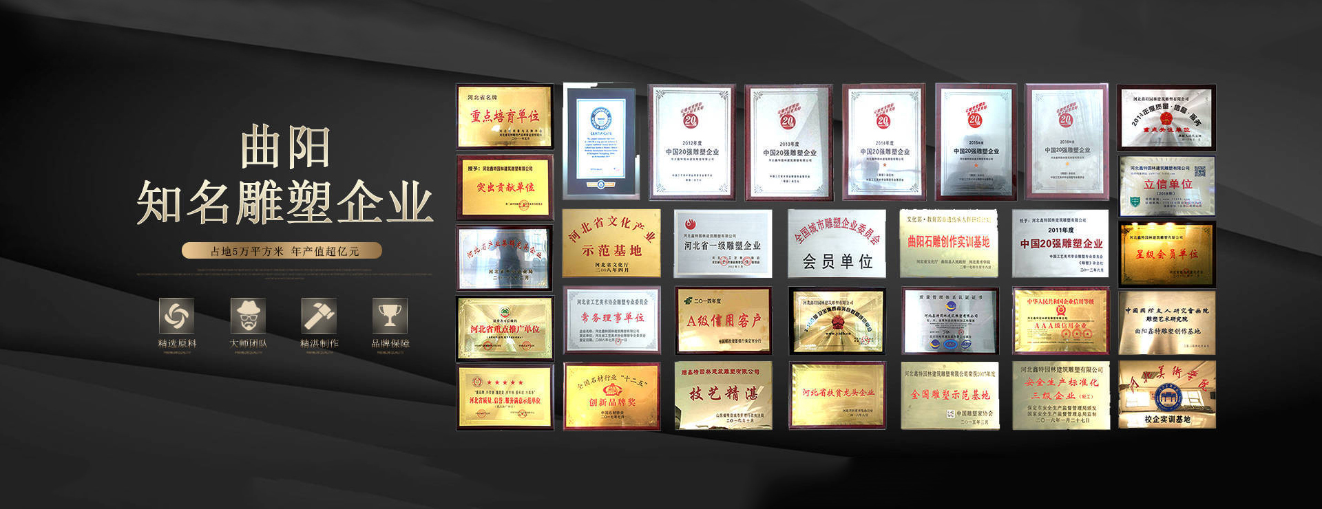 同時,公司也是行業內的佼佼者,連續(xù)七年榮獲“中國20強雕塑企業”,并被命名為“全國雕塑示范基地”,在國內外雕塑藝術領域享有較高聲譽。2017年,曲陽縣河北鑫特園林雕塑公司還被文化部、教育部、人社部命名為“中國非遺石雕傳承人群研培實訓基地”。